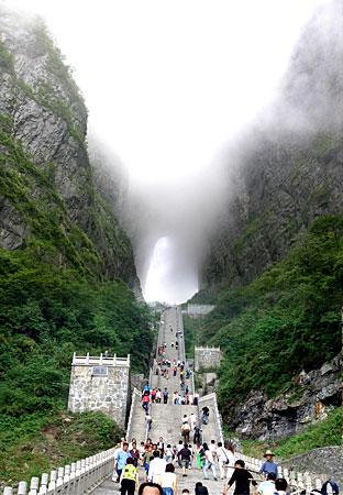 選擇乘索道游覽天門(mén)山是最佳視角。索道吊廂一出站房,馬上就騰空飛了起來(lái),從城市的一棟棟樓頂掠過(guò),猶如在城市上空滑翔。翻過(guò)一道山梁之后,城市被遠(yuǎn)遠(yuǎn)拋在了視線(xiàn)以外,大片翠綠的稻田映入眼簾,透過(guò)打開(kāi)的通風(fēng)窗口,一陣陣青草水田特有的清香沁入心脾。或高或低的農(nóng)舍不時(shí)從我們身下滑過(guò),牛羊們?nèi)齼蓛捎崎e的在田間浮動(dòng)著,靜謐、安詳。再翻過(guò)一座山峰,我們便立即被滿(mǎn)山的青翠所包圍,萬(wàn)仞絕壁也已投懷送抱。索道支架矗立于絕壁天險(xiǎn)中,或挺立或傾倒或探頭或擁抱,我們繼續(xù)在艱險(xiǎn)中游歷,時(shí)而隱沒(méi)于云堆,時(shí)而出世于蒼穹。這時(shí)你除了那滿(mǎn)懷的驚險(xiǎn)刺激外有的便只有望索而興嘆了。我拍了很多片子,但是總覺(jué)得還是沒(méi)有足以記錄下來(lái)這座空中盆景的壯麗。