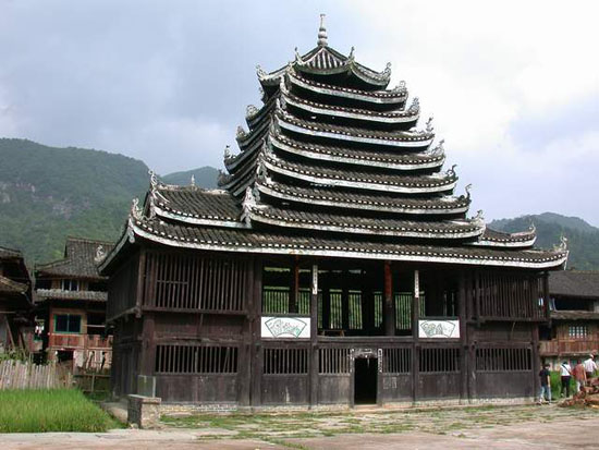 位于通道侗族自治縣坪陽鄉(xiāng)田心寨境內(nèi),始建于清順治年間,為侗族獨(dú)特建筑。方形二層樓閣,九層八柱,木結(jié)構(gòu)。邊寬8米,高20米。頂蓋為八角形,上托葫蘆寶頂。封檐板與樓內(nèi)大梁彩繪民間圖畫,各檐翹角飾禽獸浮雕。底層設(shè)火塘,四周置木凳。二樓正面系活動板壁,可兼做戲臺。