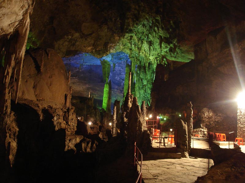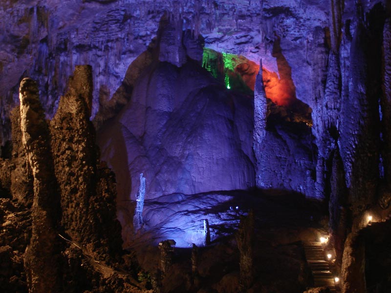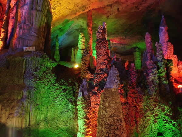 九天洞屬喀斯特地貌的特大溶洞,構造復雜,發(fā)育于新華夏一極構造三隆起南段,屬地層性復二迭系。目前已經探明可供游覽的面積有 250 公頃,號稱“亞洲第一大洞”。常年溫度 20-22 攝氏底。